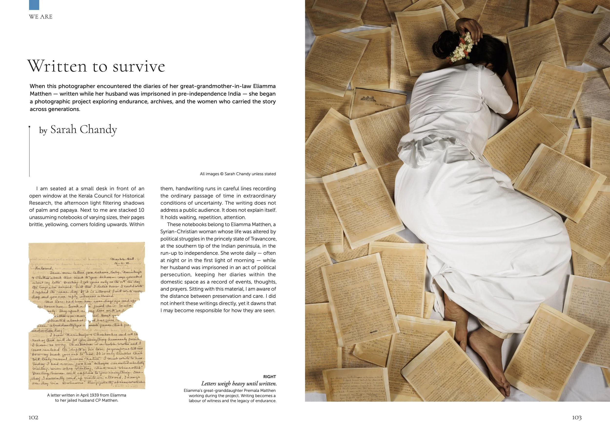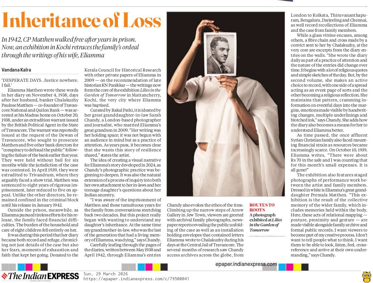 Lilies in the Garden of Tomorrow (2025) is a multi-layered exhibition and research project, exploring a female story of resilience amid personal and political crises in pre-independence India. Based on diaries written between 1938-1942 by my great grandmother-in-law Eliamma Matthen, a Syrian Christian from Kerala, it follows her fight against the unjust imprisonment of her husband, her struggle to obtain his release, and her efforts maintain her family, faith and community. Blending family and public archives with performative reinterpretation and documentary imagery, the project draws on a collaboration with five generations of family. It is curated by Bakul Patki and produced with Yolk Studio.